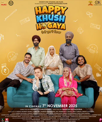 SYNOPSIS: Happy Khush Ho Gaya follows Happy and his two friends-small-time crooks chasing big dreams. Their latest scam? A fake police academy. When that collapses, Happy hatches a wilder con: pretending to be the reincarnation of Khushal Singh, a rich villager who died 30 years ago. Surprisingly, the plan works-until Khushal's estranged wife Naseebo returns to claim her long-lost husband. With unseen challenges, a furious fiancee, and an accidental "wife" twice his age, Happy is trapped in chaos. Hilarious, heartwarming, and full of twists, the film explores identity, belief, and the cost of ambition-all wrapped in laughter and entertainment!